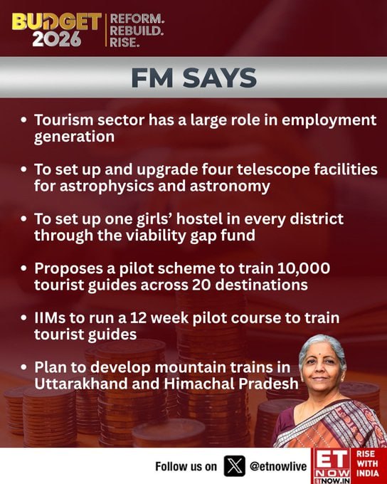 Budget 2026: Tourism & Culture Surge Heritage Development - 15 archaeological sites (Sarnath, Hastinapur) into vibrant destinations - Digital Knowledge Grid for all significant places Job Creation - Ecosystem for researchers, historians, tech partners - Bridges local employment with tourism growth Khelo India - New mission launch for grassroots sports Hospitality Push - National Institute of Hospitality: academia-industry-govt link - Upskill 10k guides; trekking, Turtle/Birdwatching trails Stocks to Watch - IRCTC, ixigo (OTAs); hotel stocks (IHCL, Lemon Tree) Key Takeaway: Multi-trail tourism + heritage grid accelerates sector revival – target travel infra and hospitality for quick gains.